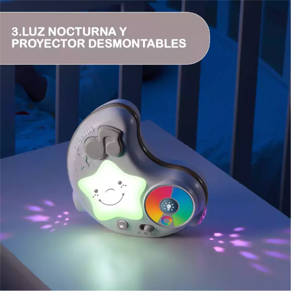 MANTA ELECTRÓNICA DE JUEGOS: la luz nocturna en forma de luna reproduce melodías y proyecta estrellas con cambios de color automáticos; la luz y la música pueden activarse por separado y cuentan con un temporizador de 15 o 30 min