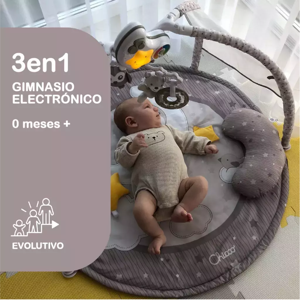 NOCHE Y DÍA: el gimnasio de actividades de Chicco, con una alfombra infantil y un cojín blando, cuenta con 3 configuraciones según la edad del niño y 3 modos electrónicos para entretener y relajar con música y luces